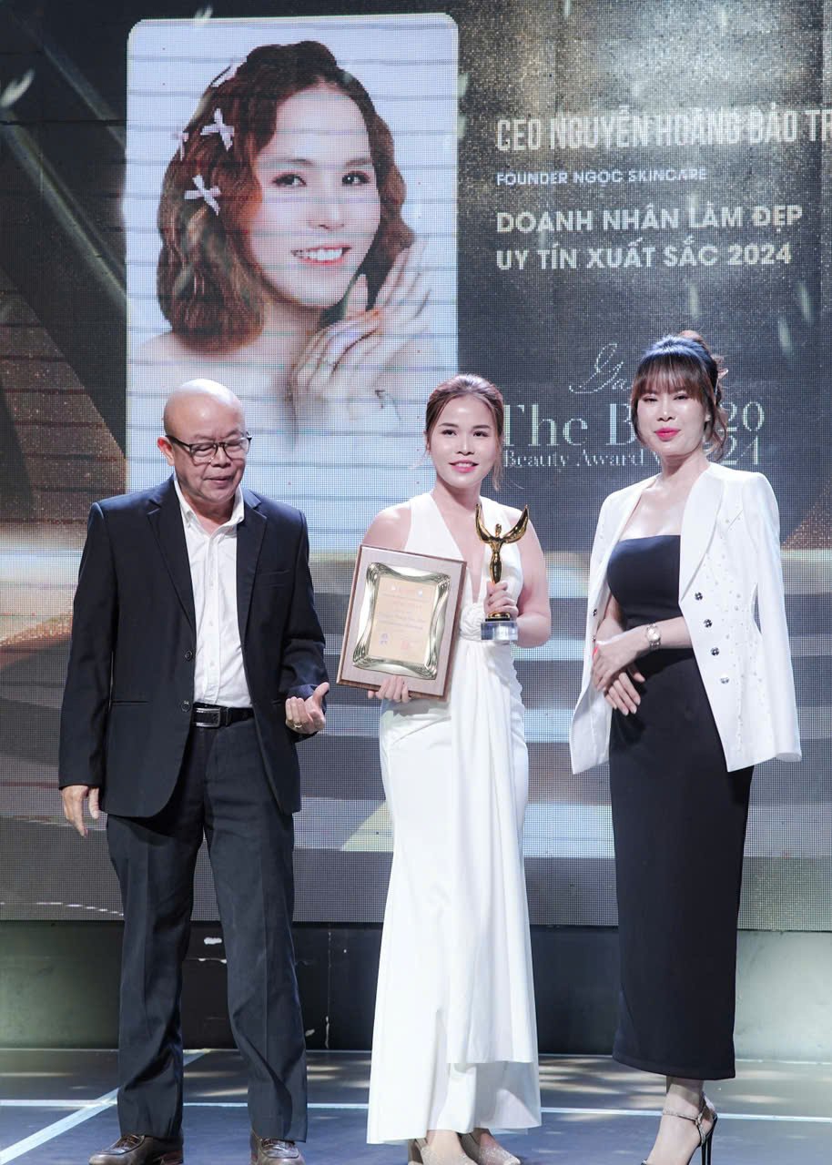 Trong không khí trang trọng, Nguyễn Hoàng Bảo Trinh, CEO của Ngọc Skincare, đã được vinh danh với danh hiệu “Doanh Nhân Làm Đẹp Uy Tín Xuất Sắc 2024”, khẳng định vị trí của cô trong ngành công nghiệp làm đẹp tại Việt Nam.